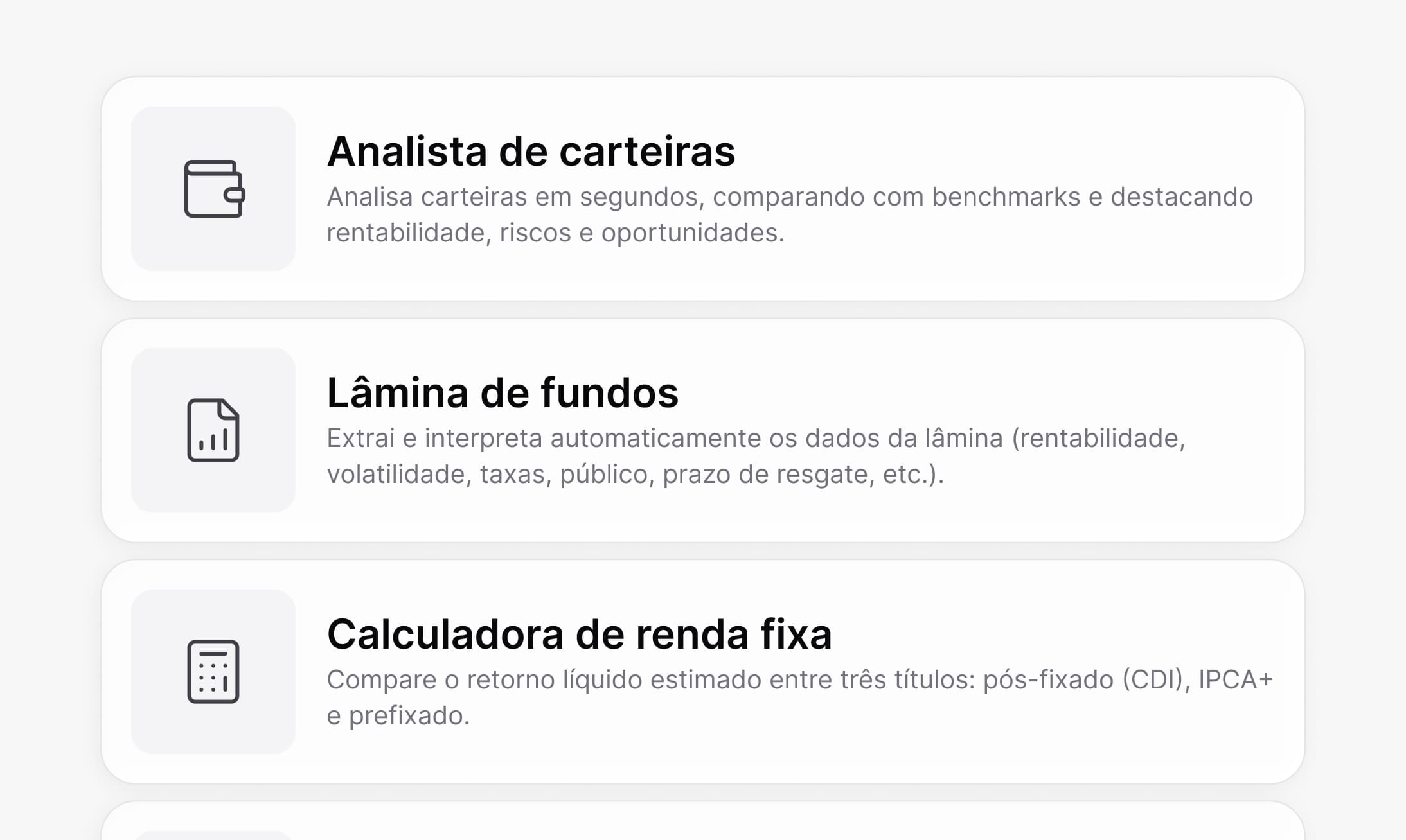 Agentes dedicados para fundos, carteiras, comparadores, suitability e fluxos internos. Cada agente aprende o padrão de análise da sua casa, seguindo regras, métodos e diretrizes internas.